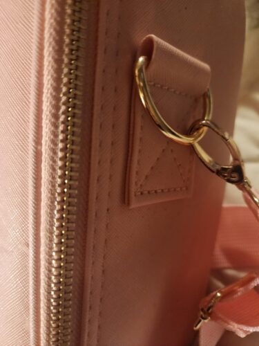 The added shoulder carry strap is sturdy and easily clipped onto the metal links on the outside and is adjustable to whichever length is comfortable for you. There is also 3 additional metal links on yhe backside, 1 on the top in the middle and 2 more on each side at the bottom so that way you can add any additional straps if you have them to carry as a backpack style or any variation you find comfortable. There is also a back side open slot area (not sure what to call it lol) that would let you slide it onto a suitcase metal handle or rolling type cart if you've got one so that way you don't have to carry it.