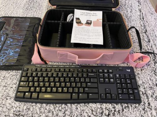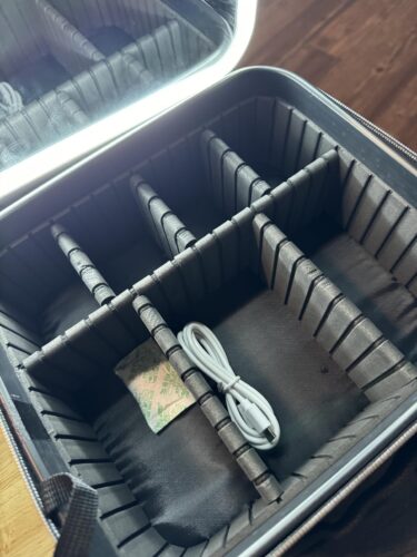 - The case includes a removable divider that accommodates my wife’s makeup brushes. It divides the main compartments from the lighted mirror. It also includes a small but ample jewelry case, moveable compartments and a charging cable (but no charging block).