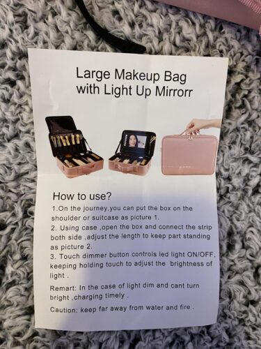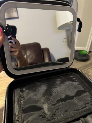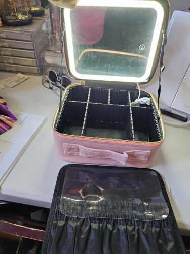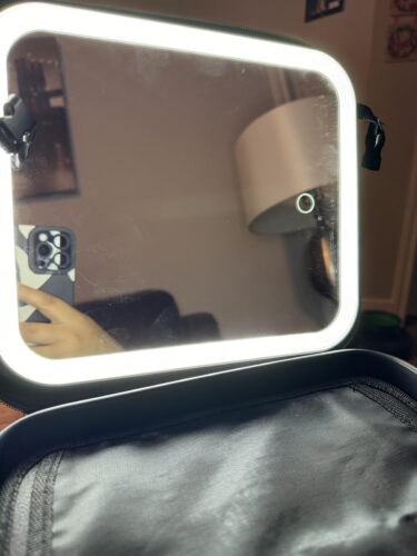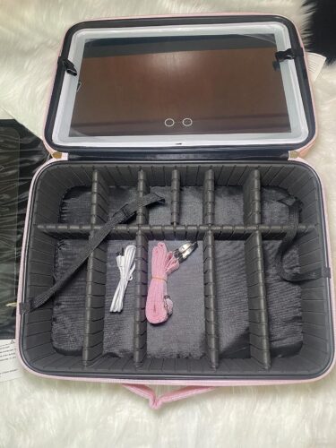 It comes with a rechargeable light up mirror (cord included) that can be attached inside the lid of the case with the attached Velcro. It has 3 light settings: cool, natural, and warm. It can also be dimmed or brightened as needed. It has small pockets that can be used to store additional items, such as the mirror charger and strap.