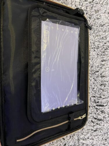 Once opened, the top has a nice mirror with LED lighting that cam dim and brighten. They did provide the charging cable/wire. There is also a pocket for storage behind the mirror that zips closed. There are 2 straps on each side that can be adjusted to hold the mirror at different angles. And the mirror did come with a plastic film to protect during shipping. The mirror was also in perfect shape when received.